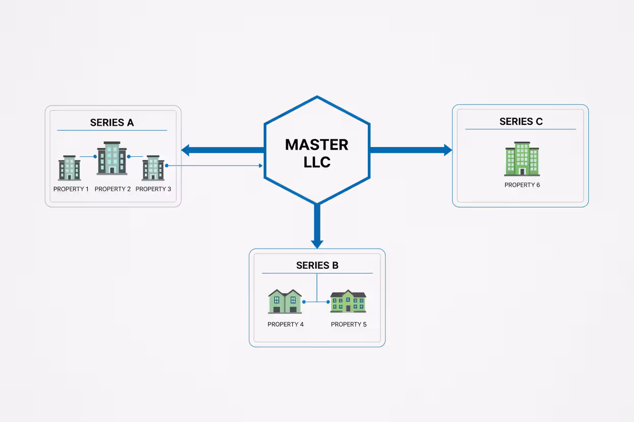 The master LLC, "Riverside Property Holdings LLC," establishes Series A through Series F. Each series holds title to one property: Series A owns the duplex on Maple Street, Series B owns the fourplex on Oak Avenue, and so forth. Each property has its own bank account receiving rental income and paying property-specific expenses.